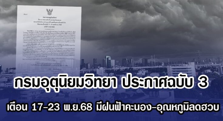 เมื่อวันที่ 16 พ.ย.68 น.ส.สุกันยาณี ยะวิญชาญ อธิบดีกรมอุตุนิยมวิทยา ประกาศกรมอุตุนิยมวิทยา เรื่อง อากาศหนาวเย็นบริเวณประเทศไทยตอนบน ฝนตกหนักถึงหนักมากบริเวณภาคใต้ และคลื่นลมแรงบริเวณอ่าวไทย (มีผลกระทบตั้งแต่วันที่ 17-23 พ.ย.68) ฉบับที่ 3 (342/2568) ระบุว่า ในช่วงวันที่ 17 – 23 พ.ย.68 ประเทศไทยตอนบนจะมีอากาศแปรปรวน โดยจะมีฝนฟ้าคะนองเกิดขึ้นได้บางพื้นที่ในระยะแรก