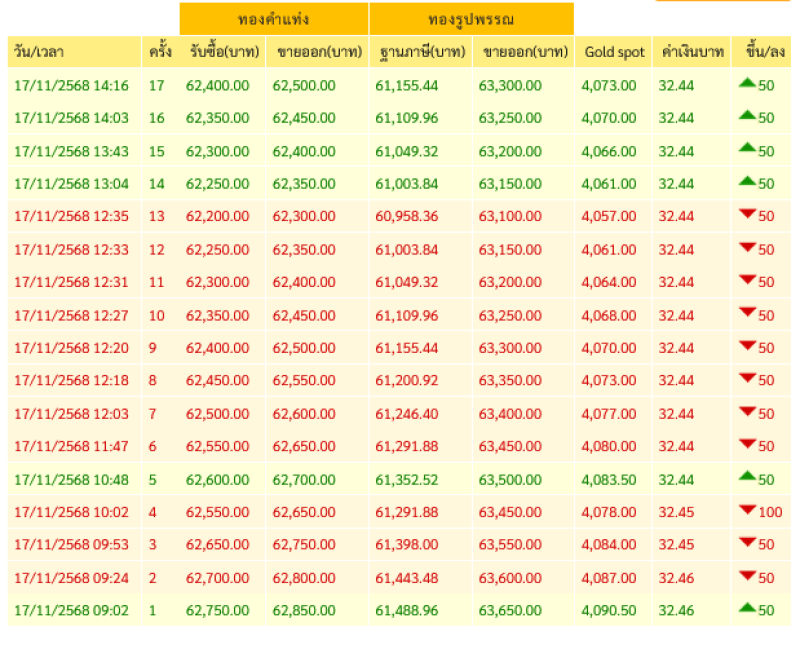 ราคาทองคำ วันที่ 17 พฤศจิกายน 2568 ปรับครั้งที่ 17
