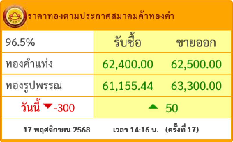 สำหรับราคาทองคำเปิดตลาดประจำวันที่ 17 พฤศจิกายน 2568 เปิดตลาด โดยทองรูปพรรณขายออกบาทละ 63,300.00 ตามข้อมูลจากเว็บไซต์ของ สมาคมค้าทองคำ เวลา 14:16 น. ปรับครั้งที่ 17