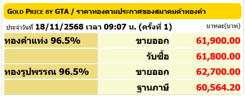 สำหรับราคาทองคำเปิดตลาดประจำวันที่ 18 พฤศจิกายน 2568 เปิดตลาดปรับลง 850 บาท ในครั้งที่1 โดยทองรูปพรรณขายออกบาทละ 62,700 ตามข้อมูลจากเว็บไซต์ของ สมาคมค้าทองคำ เมื่อเวลา 09.07 น.