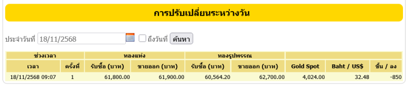 ราคาทองคำ วันที่ 18 พฤศจิกายน 2568
