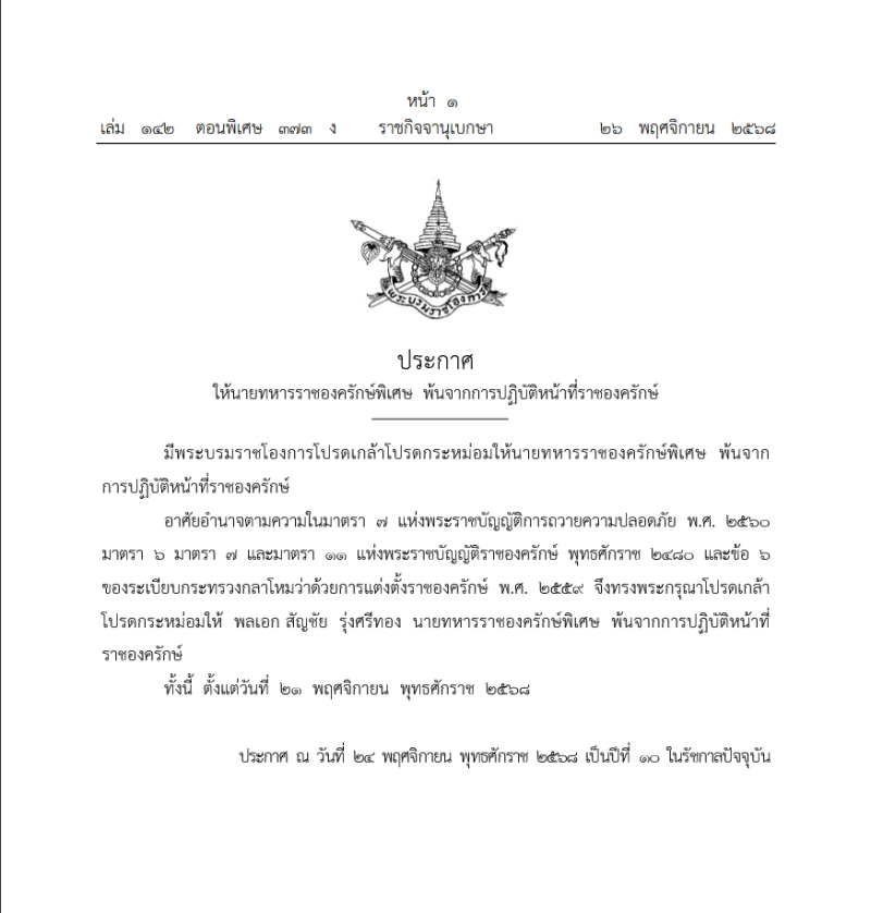 เมื่อวันที่ 26 พฤศจิกายน 2568 ที่ผ่านมา เว็บไซต์ราชกิจจานุเบกษา เผยแพร่พระบรมราชโองการ ประกาศ ให้นายทหารราชองครักษ์พิเศษ พ้นจากการปฏิบัติหน้าที่ราชองครักษ์ โดยมีเนื้อหาดังนี้