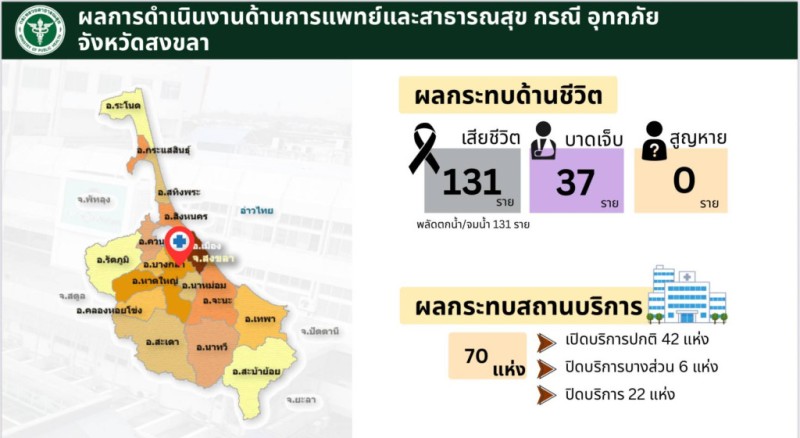 เจาะลึกลงไปที่จังหวัดสงขลา ผู้เสียชีวิต 131 ราย เกิดจากจมน้ำทั้งหมด ส่วนผู้บาดเจ็บมี 37 ราย และไม่มีผู้สูญหาย