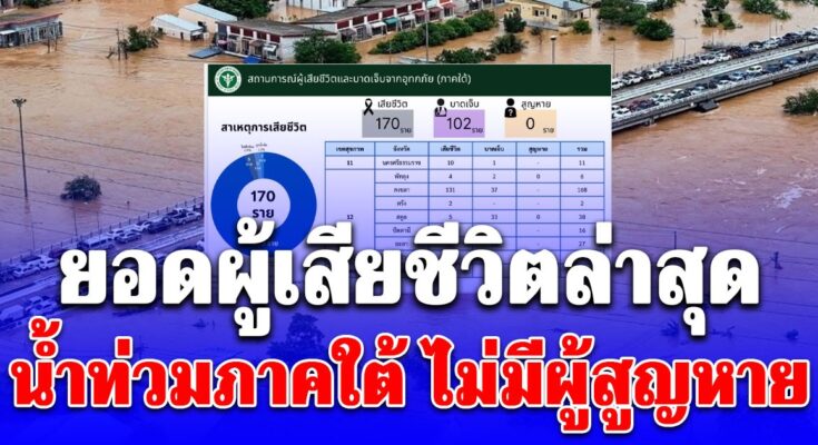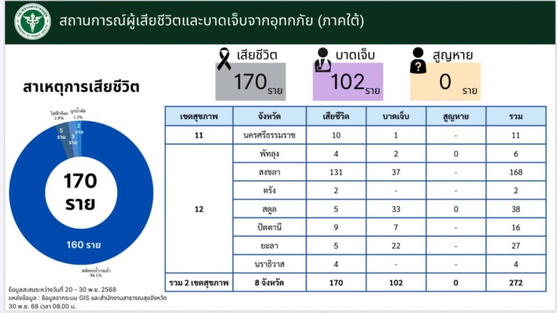 เมื่อวันที่ 30 พ.ย. 2568 กระทรวงสาธารณสุข (สธ.) รายงานสถานการณ์ผู้เสียชีวิต และบาดเจ็บจากอุทกภัย ภาคใต้ จากข้อมูล ระหว่างวันที่ 20-30 พ.ย.2568 ณ เวลา 08.00 น.(ข้อมูลจาก GIS และสำนักงานสาธารณสุขจังหวัด) มีจำนวนผู้เสียชีวิต 170 ราย โดยมีสาเหตุมาจากจมน้ำ 160 ราย, ไฟฟ้าช็อต 5 ราย, ถูกน้ำพัด 2 ราย และเหตุอื่น ๆ อีก 3 ราย