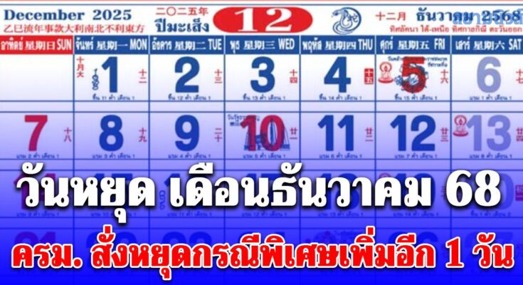 วันหยุดเดือนธันวาคม 2568