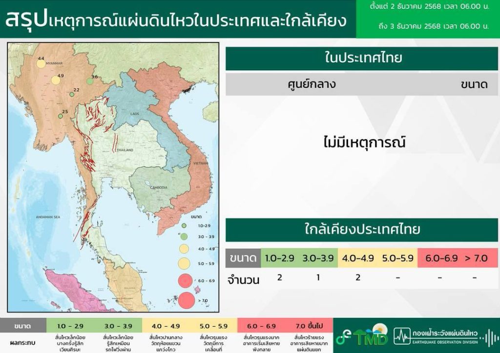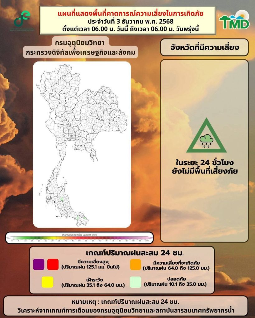 อนึ่ง ในช่วงวันที่ 4–6 ธ.ค. 68 ประเทศไทยตอนบนจะมีฝน/ฝนฟ้าคะนองเกิดขึ้นได้บางพื้นที่ ส่วนภาคใต้จะมีฝนเพิ่มขึ้น และมีฝนตกหนักบางแห่ง เนื่องจากบริเวณความกดอากาศสูงหรือมวลอากาศเย็นกำลังปานกลางระลอกใหม่จากประเทศจีนได้แผ่ลงมาปกคลุมประเทศจีนตอนใต้แล้ว คาดว่าจะแผ่ลงมาปกคลุมประเทศเวียดนามตอนบนและประเทศลาวตอนบนในวันนี้ (3 ธ.ค. 68) หลังจากนั้นจะแผ่ลงมาปกคลุมภาคตะวันออกเฉียงเหนือและทะเลจีนใต้ในระยะต่อไป ส่งผลทำให้มีคลื่นกระแสลมฝ่ายตะวันออกพัดนำความชื้นเข้ามาปกคลุม