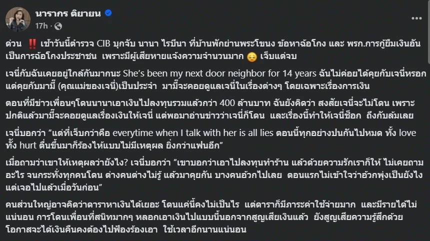 “ต๊ะ นารากร” ได้ออกมาโพสต์ข้อความ ล่าสุดผ่านเฟซบุ๊ก นารากร ติยายน ในเรื่องของ คดีนานา และ เจนี่ ระบุว่า