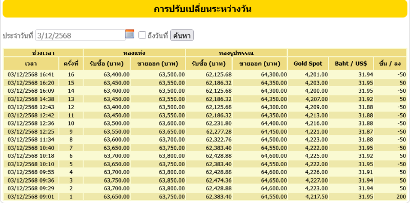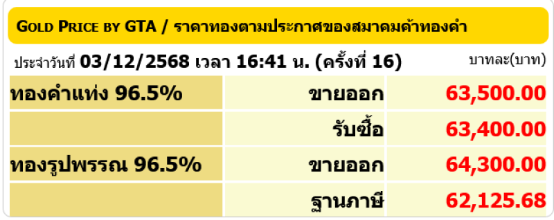 สำหรับราคาทองคำเปิดตลาดประจำวันที่ 3 ธันวาคม 2568 เปิดตลาดปรับขึ้น 200 บาท ในครั้งที่1 ต่อมามีการปรับขึ้น-ลง รวมแล้ว 16 ครั้ง โดยทองรูปพรรณขายออกบาทละ 64,300 ตามข้อมูลจากเว็บไซต์ของ สมาคมค้าทองคำ เมื่อเวลา 16.41 น.