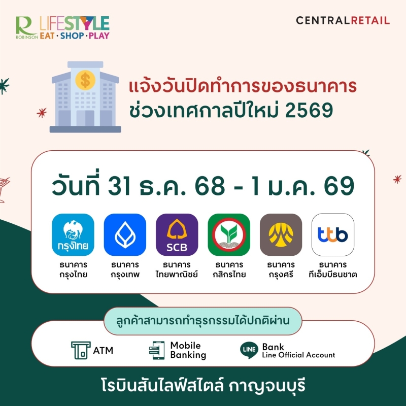 จากกรณี แจ้งปิดธนาคารช่วงปีใหม่ Robinson Lifestyle Kanchanaburi ได้โพสต์ถึงลูกค้าทุกคนแจ้งเตือนวันหยุดธนาคารดัง โดยระบุว่า สำหรับลูกค้าที่มาใช้บริการที่ โรบินสันไลฟ์สไตล์ กาญจนบุรี โปรดวางแผนการทำธุรกรรมล่วงหน้า