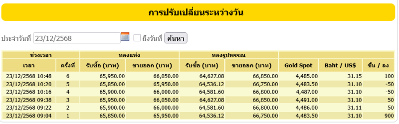 สำหรับราคาทองคำเปิดตลาดประจำวันที่ 23 ธันวาคม 2568 เปิดตลาดปรับขึ้น 900 บาท ในครั้งที่1 ต่อมามีการปรับขึ้นลงรวมแล้ว 6 ครั้ง โดยทองรูปพรรณขายออกบาทละ 66,850 ตามข้อมูลจากเว็บไซต์ของ สมาคมค้าทองคำ เมื่อเวลา 10.48 น.