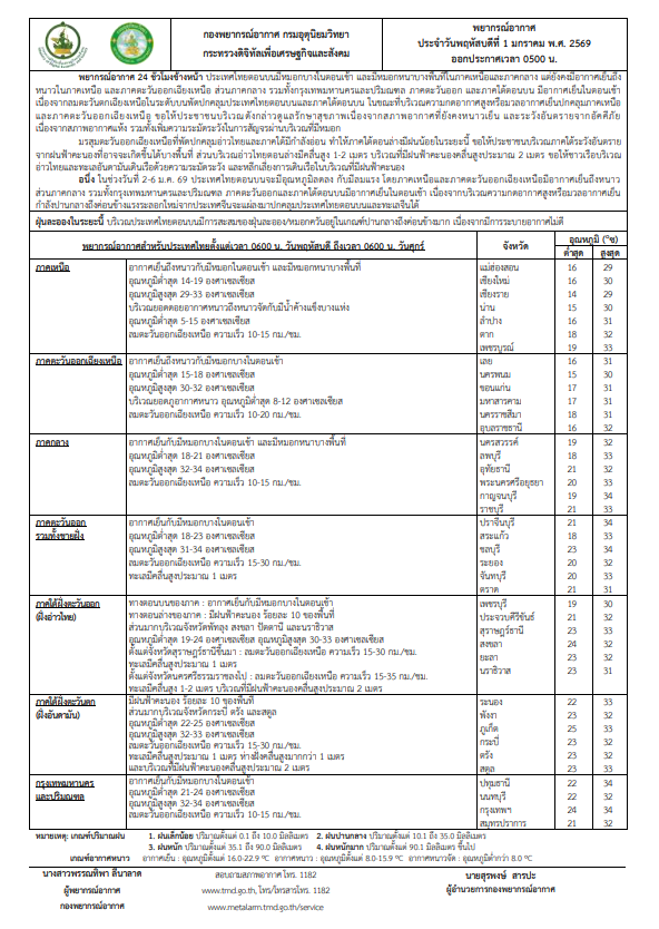 อนึ่ง ในช่วงวันที่ 2-6 ม.ค. 69 ประเทศไทยตอนบนจะมีอุณหภูมิลดลง กับมีลมแรง โดยภาคเหนือและภาคตะวันออกเฉียงเหนือมีอากาศเย็นถึงหนาว ส่วนภาคกลาง รวมทั้งกรุงเทพมหานครและปริมณฑล ภาคตะวันออกและภาคใต้ตอนบนมีอากาศเย็นในตอนเช้า เนื่องจากบริเวณความกดอากาศสูงหรือมวลอากาศเย็นกำลังปานกลางถึงค่อนข้างแรงระลอกใหม่จากประเทศจีนจะแผ่ลงมาปกคลุมประเทศไทยตอนบนและทะเลจีนใต้ ฝุ่นละอองในระยะนี้ บริเวณประเทศไทยตอนบนมีการสะสมของฝุ่นละออง/หมอกควันอยู่ในเกณฑ์ปานกลางถึงค่อนข้างมาก เนื่องจากมีการระบายอากาศไม่ดี