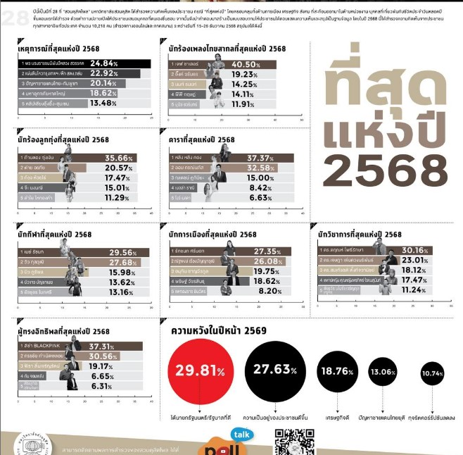 นอกจากนี้ ผลสำรวจ ความหวังในปีหน้า 2569 พบว่า ประชาชนส่วนใหญ่ต้องการเห็นการได้นายกรัฐมนตรีและรัฐบาลที่ดี พร้อมกับความเป็นอยู่ของประชาชนที่ดีขึ้น