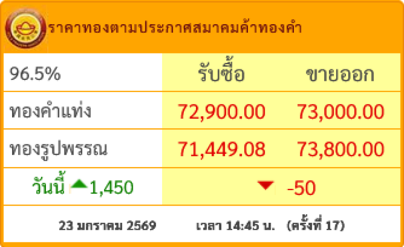ราคาทองคำประจำวันที่ 23 ม.ค.2569 โดยราคาทองรูปพรรณขยับมาอยู่ที่บาทละ 73,800.00 บาท อ้างอิงข้อมูลล่าสุดจาก สมาคมค้าทองคำ ที่เผยแพร่ผ่านทางเว็บไซต์ เมื่อเวลา 14:45 น.ปรับ(ครั้งที่ 17)