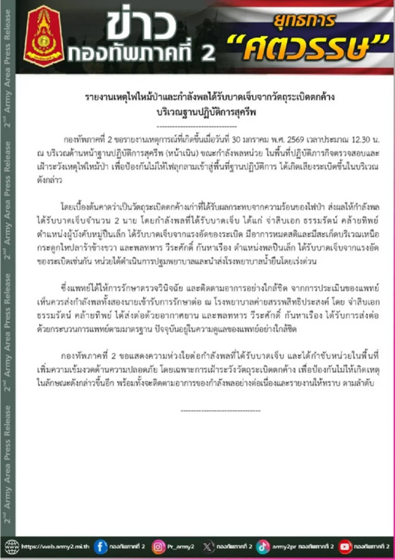 จากกรณีเมื่อวันที่ 30 มกราคม 2569 ที่ผ่านมาเกิดเหตุระเบิดจากวัตถุระเบิดตกค้างในพื้นที่ปฏิบัติการ ขณะกำลังพลกองทัพภาคที่ 2 เข้าตรวจสอบและเฝ้าระวังเหตุไฟไหม้ป่า บริเวณฐานปฏิบัติการสุครีพ ส่งผลให้ทหารได้รับบาดเจ็บ 2 นาย ก่อนเร่งนำส่งโรงพยาบาลเพื่อรักษาอย่างใกล้ชิด