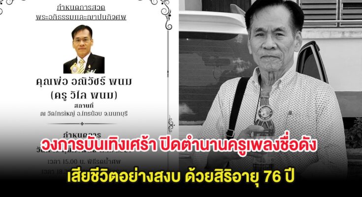 เรียกได้ว่าเป็นอีกหนึ่งข่าวเศร้าของวงการเพลงลูกทุ่งเมื่อล่าสุดทางด้านเพจดาราภาพยนตร์ ได้ออกมาโพสต์แจ้งข่าว ปิดตำนาน ครูเพลงลูกทุ่งคนดัง วิไลพนม นายกสมาคมนักแต่งเพลงลูกทุ่งประเทศไทย เสียชีวิตอย่างสงบสิริอายุ76ปี ตั้งสวด วัดไทรใหญ่ จังหวัดนนทบุรี