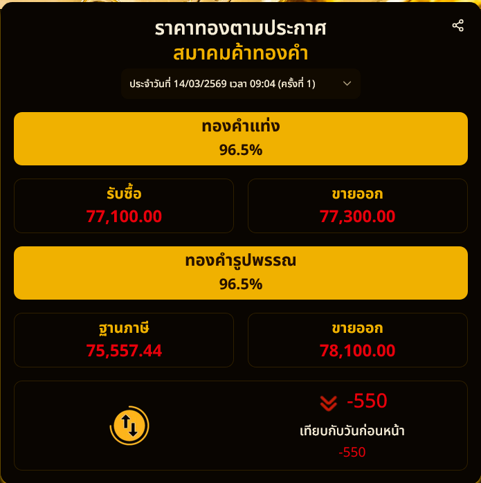 และปัจจุบัน ประกาศล่าสุด เสาร์ที่ 14 มีนาคม 69 ประกาศครั้งเดียว เวลา 09.04 น. ปรับลงแรง 550 บาท ส่งผลให้ราคาทองอยู่ที่