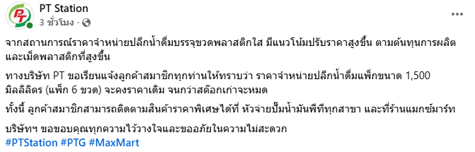 วันที่ 31 มีนาคม 2569 เพจ PTStation ออกประกาศแจ้งลูกค้าสมาชิกเกี่ยวกับสถานการณ์ราคาน้ำดื่มแพ็ก โดยระบุว่า จากแนวโน้มราคาจำหน่ายปลีกน้ำดื่มบรรจุขวดพลาสติกใสที่มีทิศทางปรับตัวสูงขึ้น อันเป็นผลมาจากต้นทุนการผลิตและราคาเม็ดพลาสติกที่เพิ่มขึ้นอย่างต่อเนื่อง