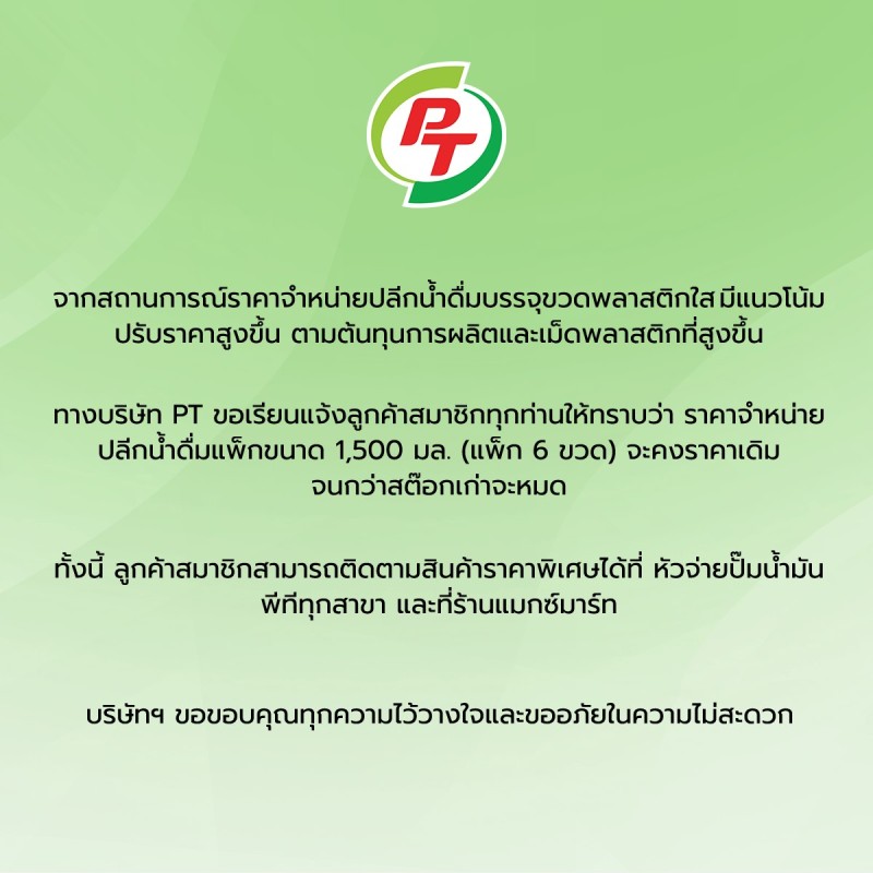 ทางบริษัท PT จึงขอแจ้งให้ลูกค้าสมาชิกทุกท่านรับทราบว่า ราคาจำหน่ายปลีกน้ำดื่มแพ็กขนาด 1,500 มิลลิลิตร (แพ็ก 6 ขวด) จะยังคงจำหน่ายในราคาเดิมไปก่อน จนกว่าสินค้าสต๊อกเดิมจะหมด
