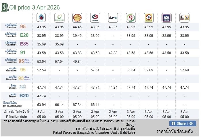 วันที่ 3 เม.ย.2569 สำนักงานนโยบายและแผนพลังงาน (สนพ.) กระทรวงพลังงาน มีการรายงานสถานการณ์ ราคาน้ำมันวันนี้ สถานีบริการน้ำมัน ได้แก่ ปตท. , บางจาก , PT , คาลเท็กซ์ , เชลล์