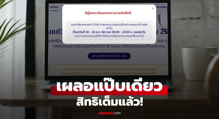 ล่าสุด เวลา 06.01 น. เว็บไซต์คนละครึ่งพลัส www.คนละครึ่งพลัส.com รายการว่า มีจำนวนผู้ลงทะเบียนครบตามวงเงินสิทธิเรียบร้อยแล้ว