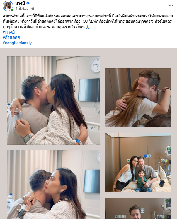 ล่าสุด เพจ นางบี ได้ออกมาอัปเดตอาการอีกครั้ง ระบุว่า อาการอ้ายสติ๊กเช้านี้ดีขึ้นแล้วค่ะ รอคุณหมอเฉพาะทางช่วงตอนบ่ายนี้ มีอะไรคืบหน้าเราจะแจ้งให้ทุกคนทราบทันทีนะคะ หวังว่าวันนี้อ้ายสติ๊กคงได้ออกจากห้อง ICU ไปพักห้องปกติได้เนาะ ขอบคุณทุกๆความห่วงใยค่ะ