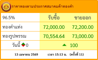 ราคาทองคำประจำวันที่ 13 เม.ย.2569 โดยทองรูปพรรณขายออกที่บาทละ 73,000.00 บาท อ้างอิงข้อมูลล่าสุดจาก สมาคมค้าทองคำ ที่เผยแพร่ผ่านทางเว็บไซต์ เมื่อเวลา 15:13 น.(ครั้งที่ 11)ที่ผ่านมา