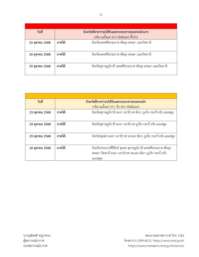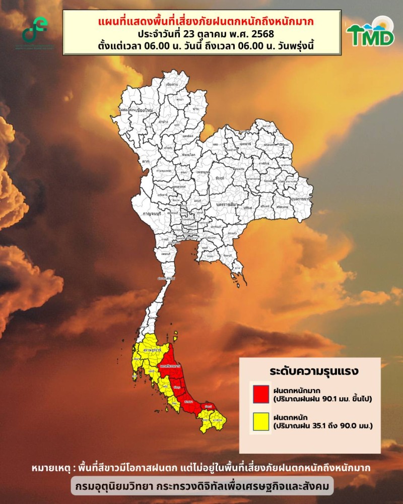 วันที่ 23 ต.ค. 2568 พยากรณ์อากาศ 24 ชั่วโมงข้างหน้า ภาคใต้มีฝนตกหนักถึงหนักมากบางแห่ง เนื่องจากร่องมรสุมพาดผ่านภาคใต้ตอนกลาง ประกอบกับมรสุมตะวันออกเฉียงเหนือ พัดปกคลุมอ่าวไทยและภาคใต้ ขอให้ประชาชนบริเวณภาคใต้ โดยเฉพาะบริเวณจังหวัดนครศรีธรรมราช พัทลุง สงขลา และปัตตานี ระวังอันตรายจากฝนฟ้าคะนอง ฝนตกหนัก และฝนที่ตกสะสม รวมทั้งเพิ่มความระมัดระวังในการสัญจรผ่านบริเวณที่มีน้ำท่วมขังในระยะนี้ไว้ด้วย ส่วนบริเวณทะเลอันดามันและอ่าวไทยมีคลื่นสูงประมาณ 1 เมตร บริเวณที่มีฝนฟ้าคะนองคลื่นสูงมากกว่า 2 เมตร ขอให้ชาวเรือเดินเรือด้วยความระมัดระวัง และหลีกเลี่ยงการเดินเรือในบริเวณที่มีฝนฟ้าคะนอง สำหรับประเทศไทยตอนบนมีอากาศเย็นในตอนเช้า อุณหภูมิจะลดลงเล็กน้อยกับมีลมแรง เนื่องจากบริเวณความกดอากาศสูงกำลังปานกลางจากประเทศจีนได้แผ่ลงมาปกคลุมภาคเหนือและภาคตะวันออกเฉียงเหนือ ขอให้ประชาชนบริเวณประเทศไทยตอนบน โดยเฉพาะภาคเหนือ และภาคตะวันออกเฉียงเหนือ ดูแลรักษาสุขภาพเนื่องจากสภาพอากาศที่เปลี่ยนแปลง