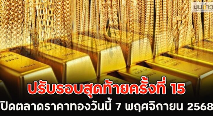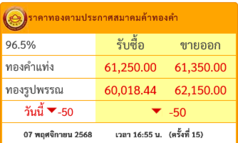 เปิดตลาด ราคาทองคำล่าสุดวันนี้ วันศุกร์ ที่ 7 พฤศจิกายน 2568 ราคาเปิดตลาดปรับลดลง 50 บาทราคาทองรูปพรรณล่าสุดวันนี้ ปรับครั้งสุดท้าย (ครั้งที่ 15) เวลา 16:55 น. ขายออกบาทละ 62,150.00 บาท