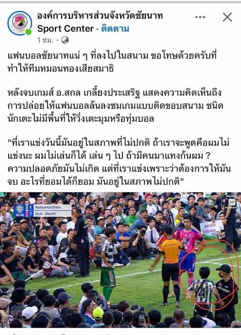 ต่อมา เพจเฟซบุ๊ก องค์การบริหารส่วนจังหวัดชัยนาท Sport Center ได้ออกมาโพสต์ข้อความว่า แฟนบอลชัยนาทแน่ๆ ที่ลงไปในสนาม ขอโทษด้วยครับที่ทำให้ทีมหมอนทองเสียสมาธิ